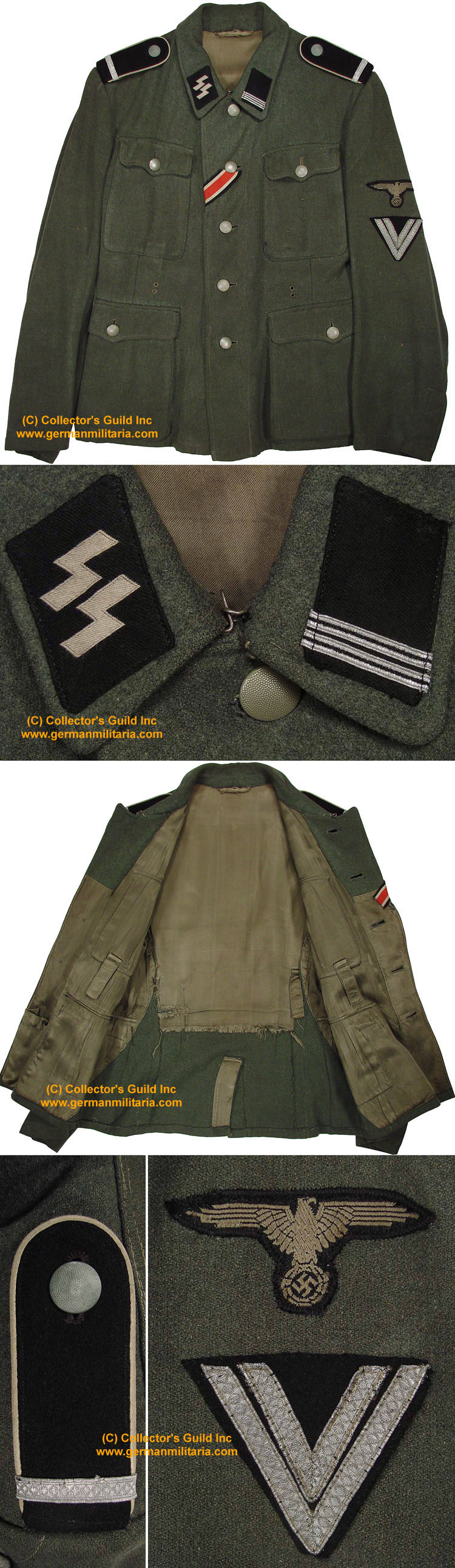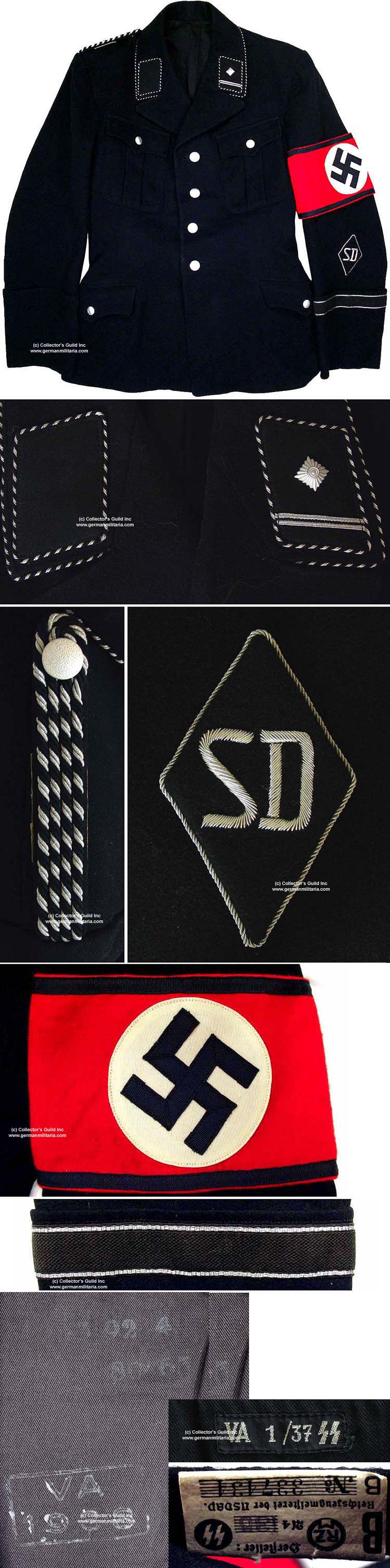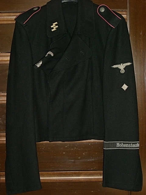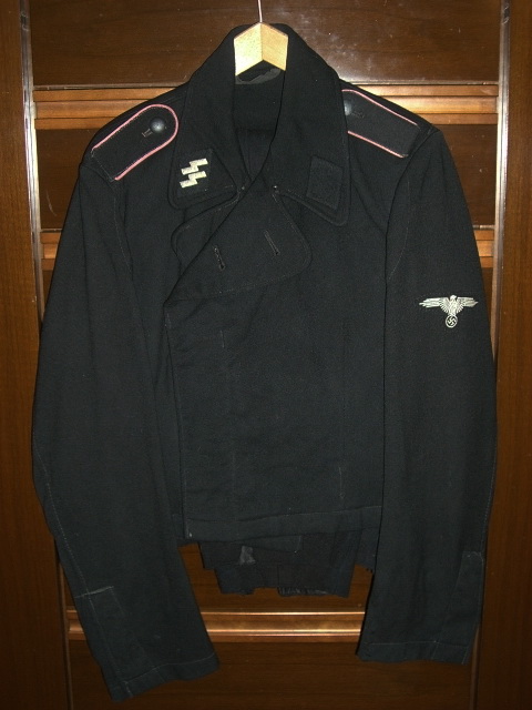 Черный открытый китель, как часть униформы войск СС был введен 7 июля 1932 года. Он был выполнен в виде куртки армейского образца и застегивался на четыре металлические пуговицы. Китель имел четыре кармана: два накладных плиссированных передних и два боковых прорезных. Клапаны всех карманов трехмысковые с застежкой на пуговицу. По краю воротника кителя шел белый или витой черно-белый кант. Такой же кант имели и петлицы. Петлицы на кителе были черного цвета, при этом левая петлица у кителей рядовых, унтер-офицеров и младших офицеров использовалась для размещения знаков различия, а правая – указания номера штандарта и размещения эмблемы воинской специальности. В дальнейшем в этой петлице размещались руны СС. У старших офицеров СС знаки различия располагались в обеих петлицах. Все знаки на петлицах были белого, серебряного или светло-серого цвета. На левом рукаве полагалась носить снабженную черным кантом красную повязку с белым кругом, в которой вписана свастика. На этом же рукаве носили манжетную ленту с указанием номера штурма, в котором служил данный конкретный военнослужащий. Черный китель надевали с черными бриджами, черными фирменными сапогами, черной фуражкой и традиционной коричневой рубахой с черным галстуком. Для удобства ношения портупеи на правом плече кителя имелся погон, с помощью которого обозначалась также принадлежность военнослужащего к одной из 5 категорий: рядовые, унтер-офицеры, младшие, средние и высшие офицеры.